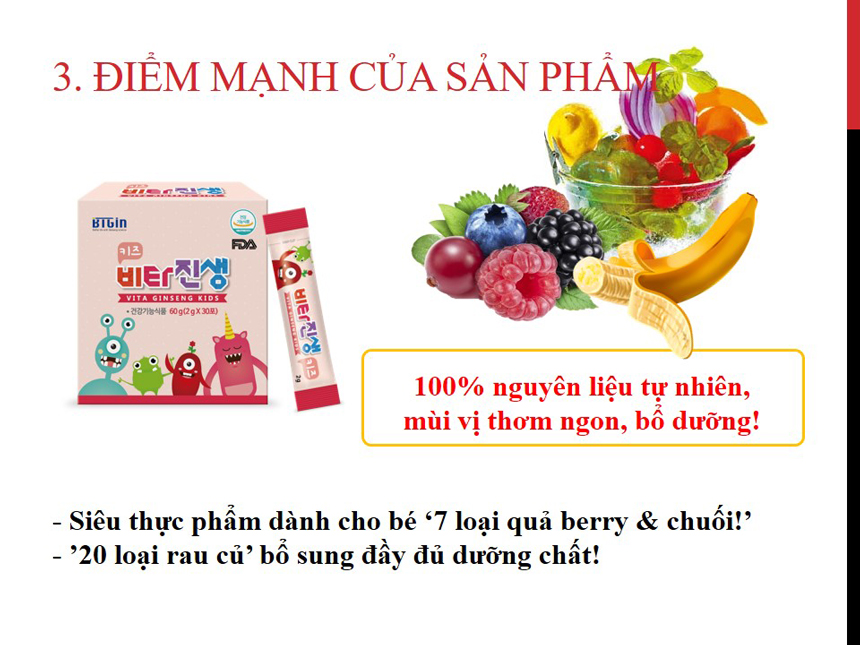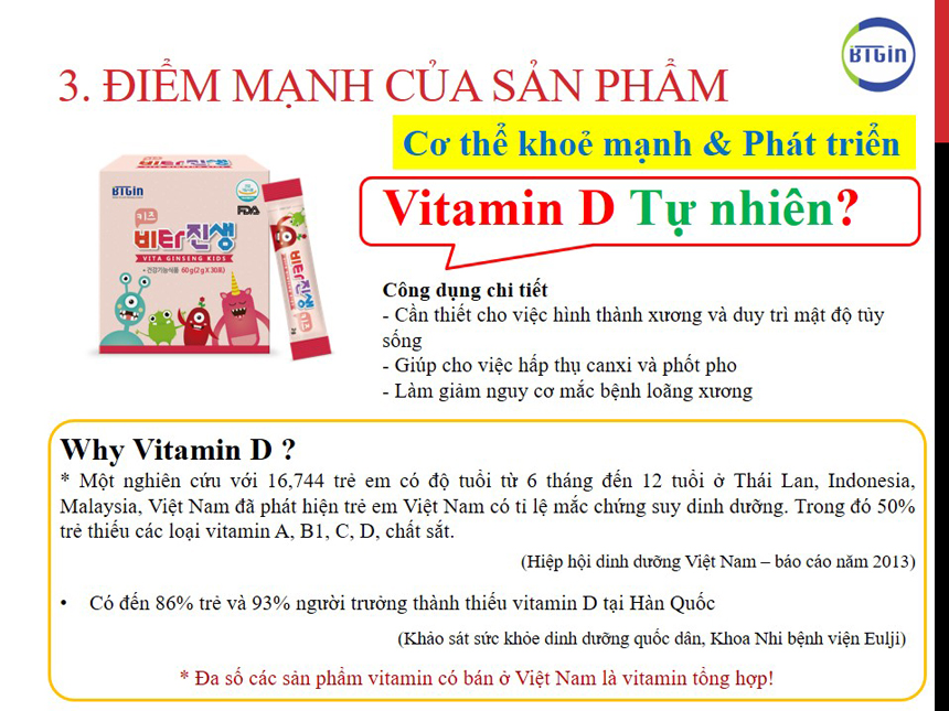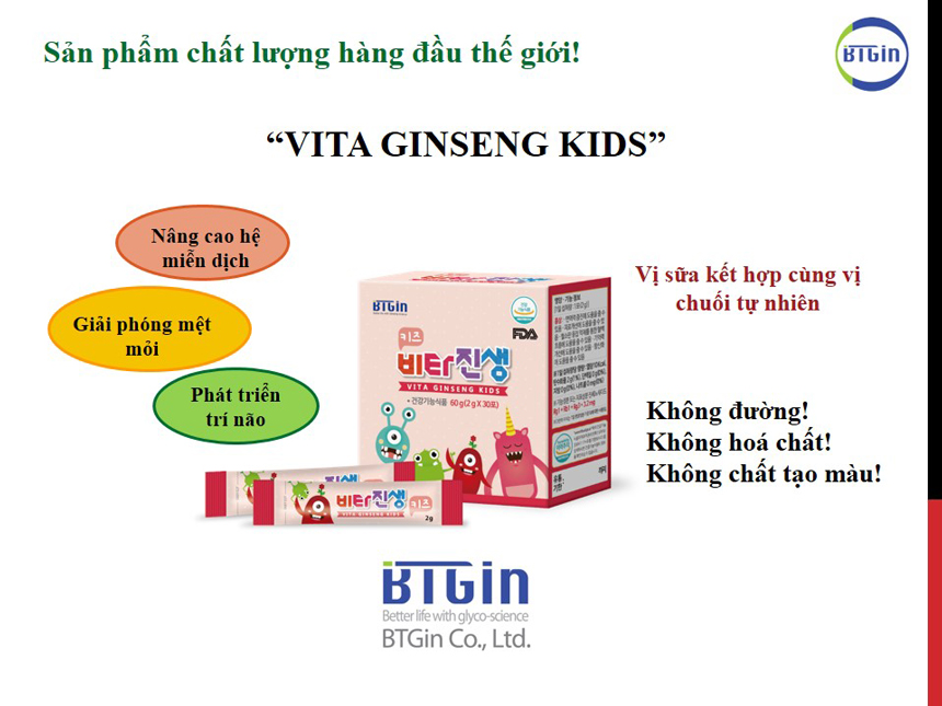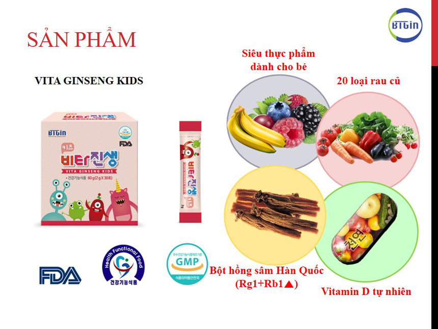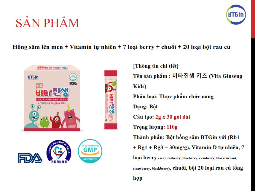 Bột hồng sâm vitamin baby vitaginseng là sản phẩm dành riêng cho trẻ em của hãng BTGin - Hàn Quốc. Được nghiên cứu và sản xuất trên dây chuyền hiện đại đạt chuẩn (GMP) về sản xuất và quản lý chất lượng của Hàn Quốc. Sản phẩm của công ty được chứng nhận bởi Cục quản lý thực phẩm và thuốc của Hàn Quốc (KFDA) chứng nhận là dòng sản phẩm thực phẩm chức năng. Sản phẩm được phát triển dựa trên dự án của chính phủ Hàn Quốc dành cho thị trường Châu Á.