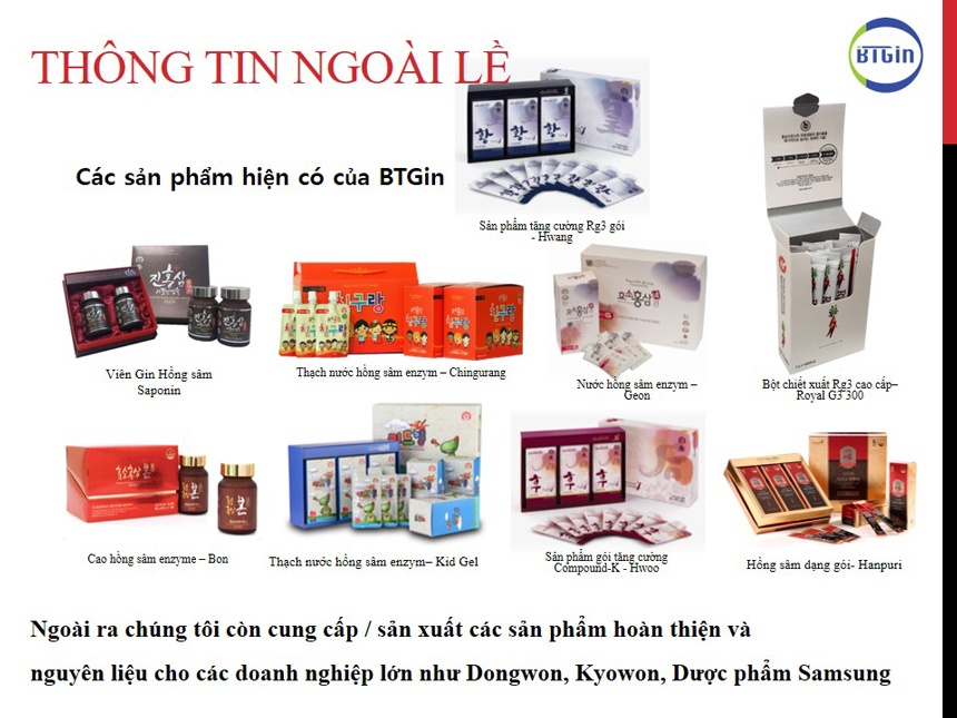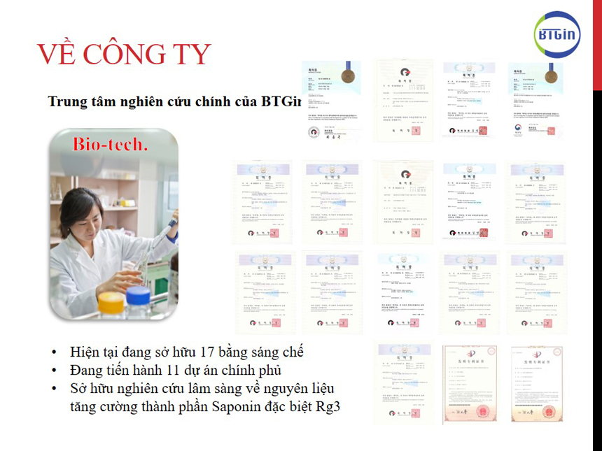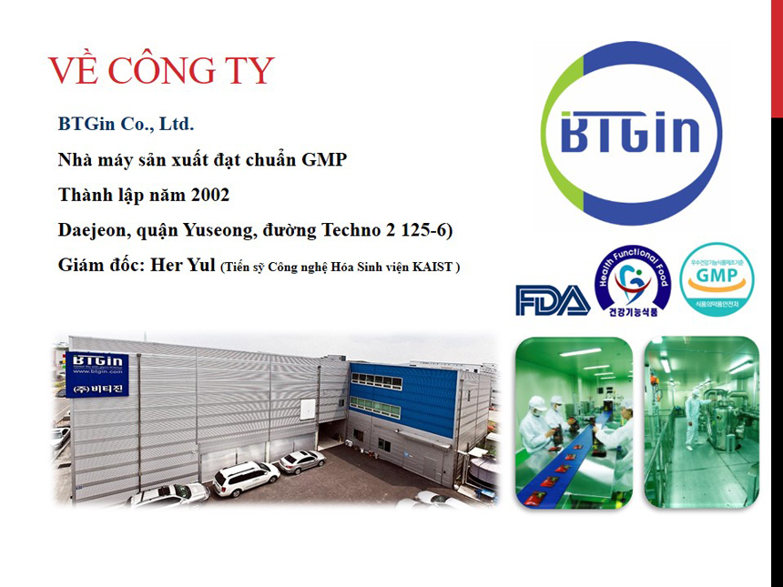 Toàn bộ các sản phẩm được nhập khẩu chính hãng bởi công ty BTGin Việt Nam. Sản phẩm được chứng nhận bởi cục an toàn thực phẩm Hàn Quốc cũng như của Việt Nam.