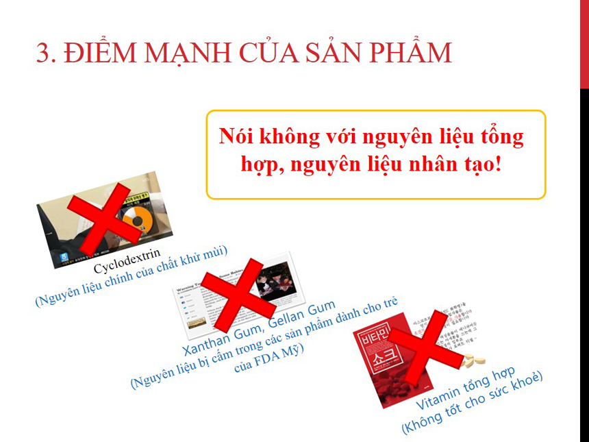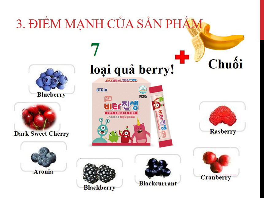 Thành phần: Bột nước cốt hồng sâm lên men [Hàn Quốc, tổng ginsenoside Rb1, Rg1 và Rg3 là 30mg/g (tỷ lệ cấu tạo củ hồng sâm 70%, rễ hồng sâm 30%)] 6.66%, bột sữa (Hàn Quốc) 41.4%, bột nước cốt chuối (Israel) 41.4% , bột nước cốt 7 loại berry 4.9%, bột nước cốt hỗn hợp rau củ 4.9%, men khô (vitamin D) 0.74%.