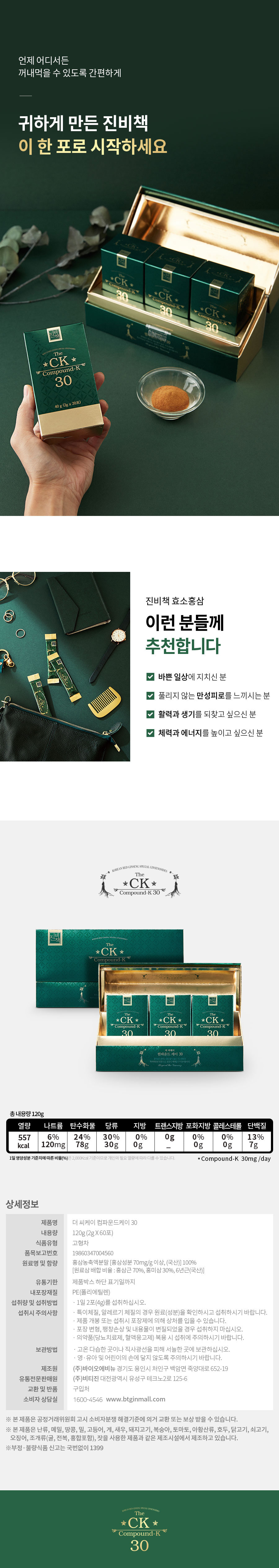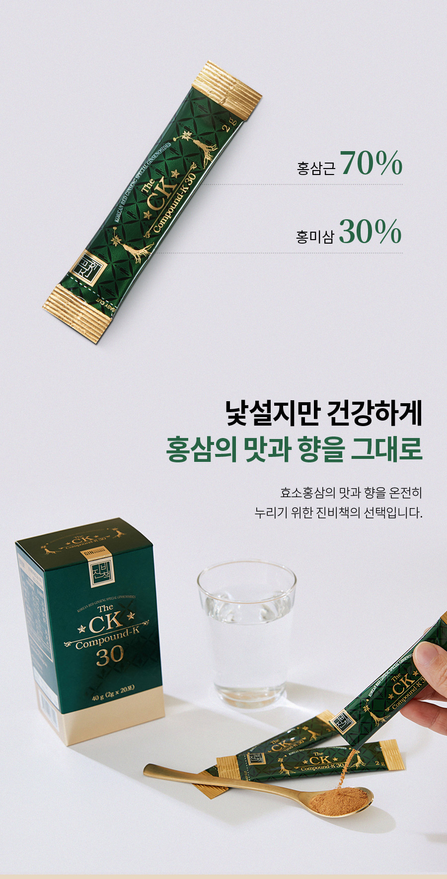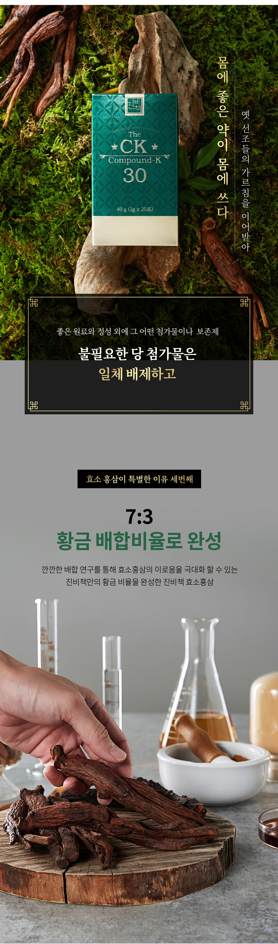 Thành phần: Bột cô đặc hồng sâm [thành phần hồng sâm 70mg/g trở lên, (nội địa Hàn Quốc)] 100% [tỷ lệ pha trộn nhân sâm thô: rễ hồng sâm 70%, hồng sâm 30%, rễ 6 năm tuổi (trong nước)]