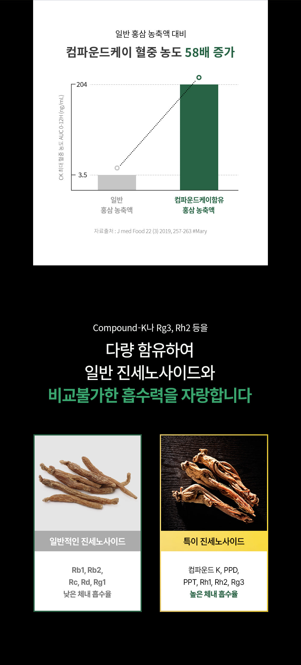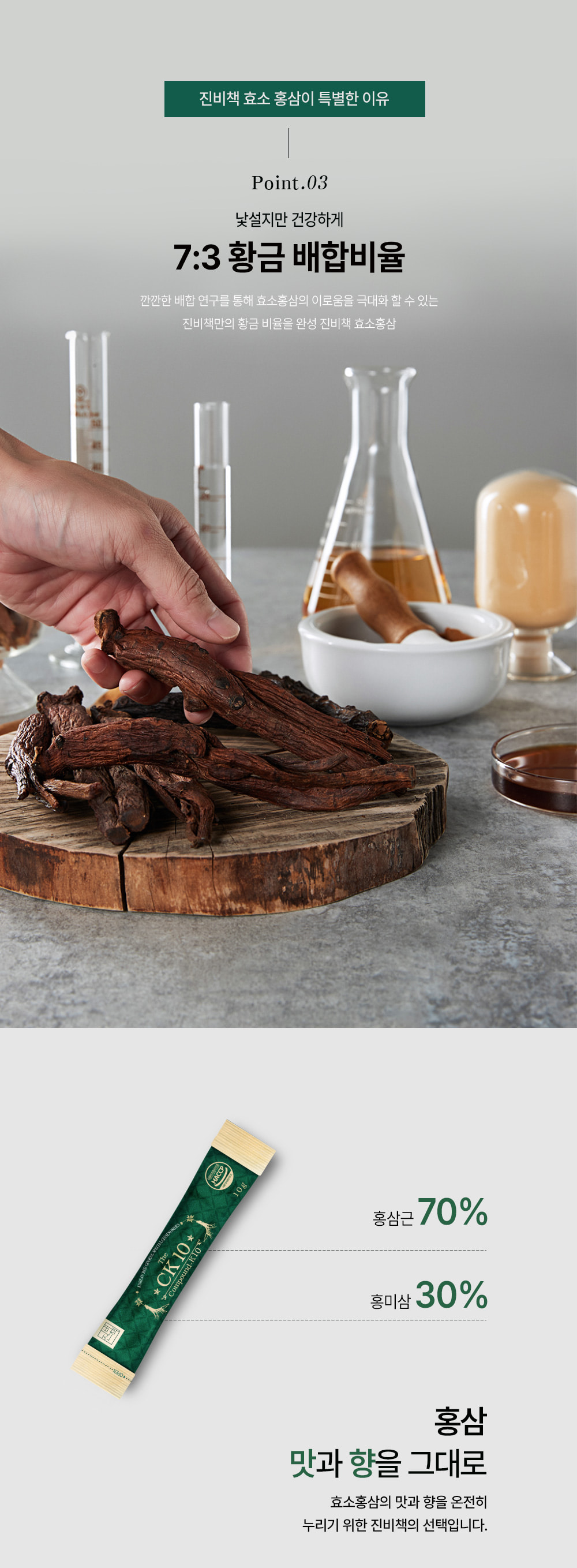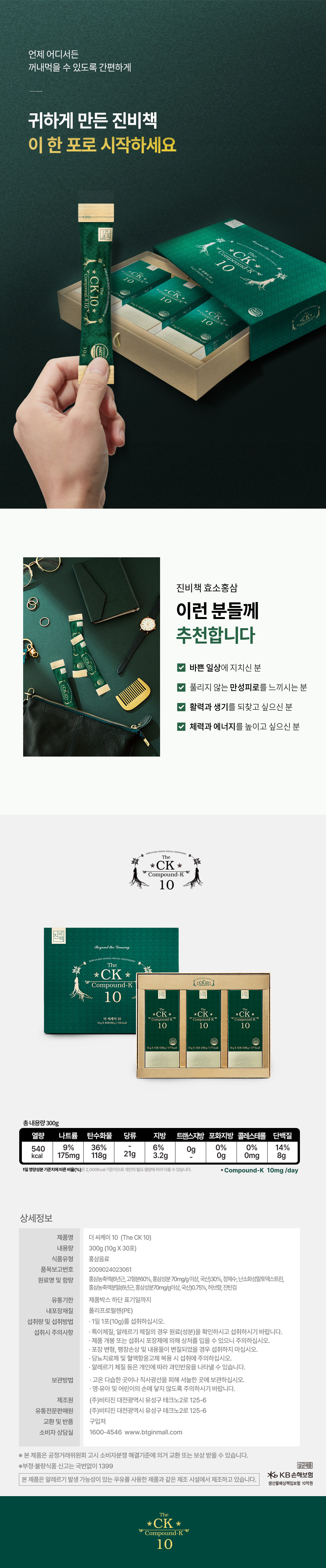 Thành phần: Hồng sâm cô đặc (6 tuổi, hàm lượng rắn 60%, nguyên liệu hồng sâm 70 mg/g trở lên, sản xuất trong nước) 30%, nước tinh khiết, maltodextrin phụ gia, bột hồng sâm cô đặc (6 tuổi, nguyên liệu hồng sâm 70 mg/ g trở lên, sản xuất trong nước) 0,75%, dược liệu..