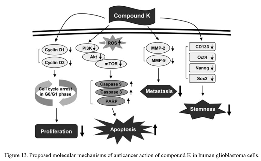 Ginsenoside Compound K có tác dụng đa cơ chế chống lại ung thư não, bao gồm:
