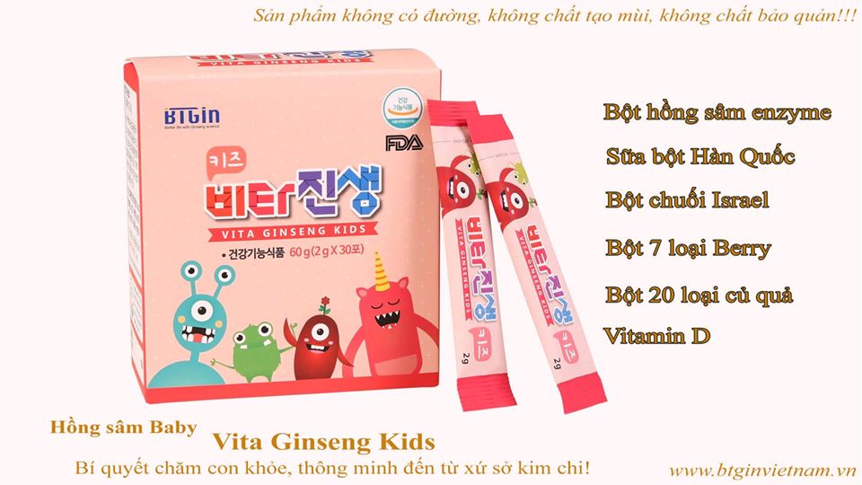 Hồng sâm baby Vita Ginseng Kid là lựa chọn sáng suốt nhất. Sản phẩm hồng sâm baby Vita ginseng Kid được chiết xuất từ loại hồng sâm 6 năm tuổi. Sản phẩm này sẽ không chỉ bổ sung các dưỡng chất từ hồng sâm mà nó còn kết hợp với rất nhiều loại vitamin, axit amin thiết yếu cho trẻ nhỏ.