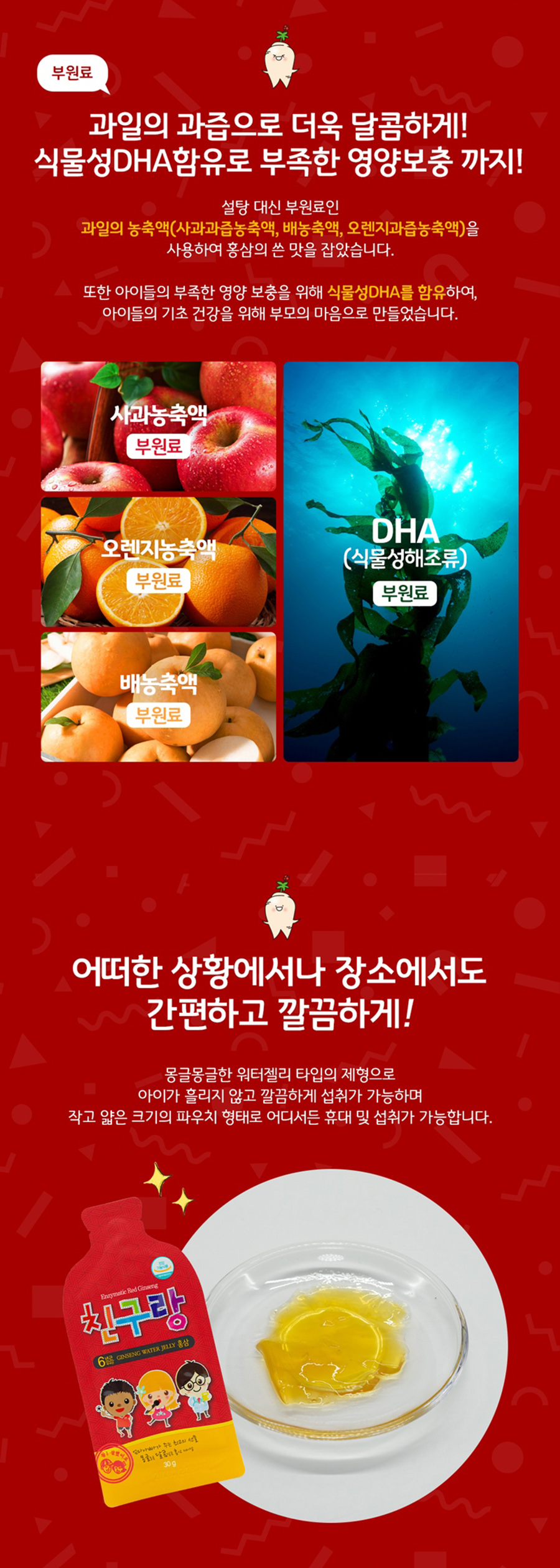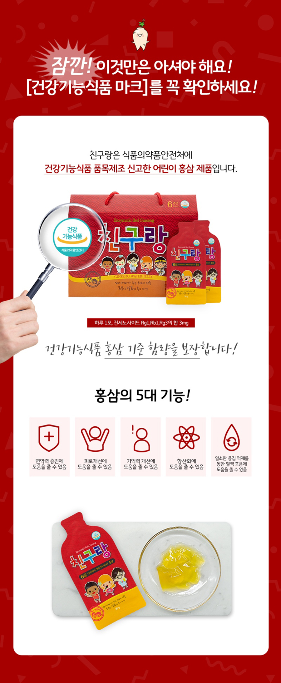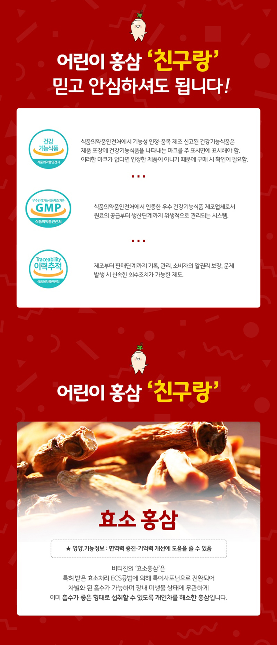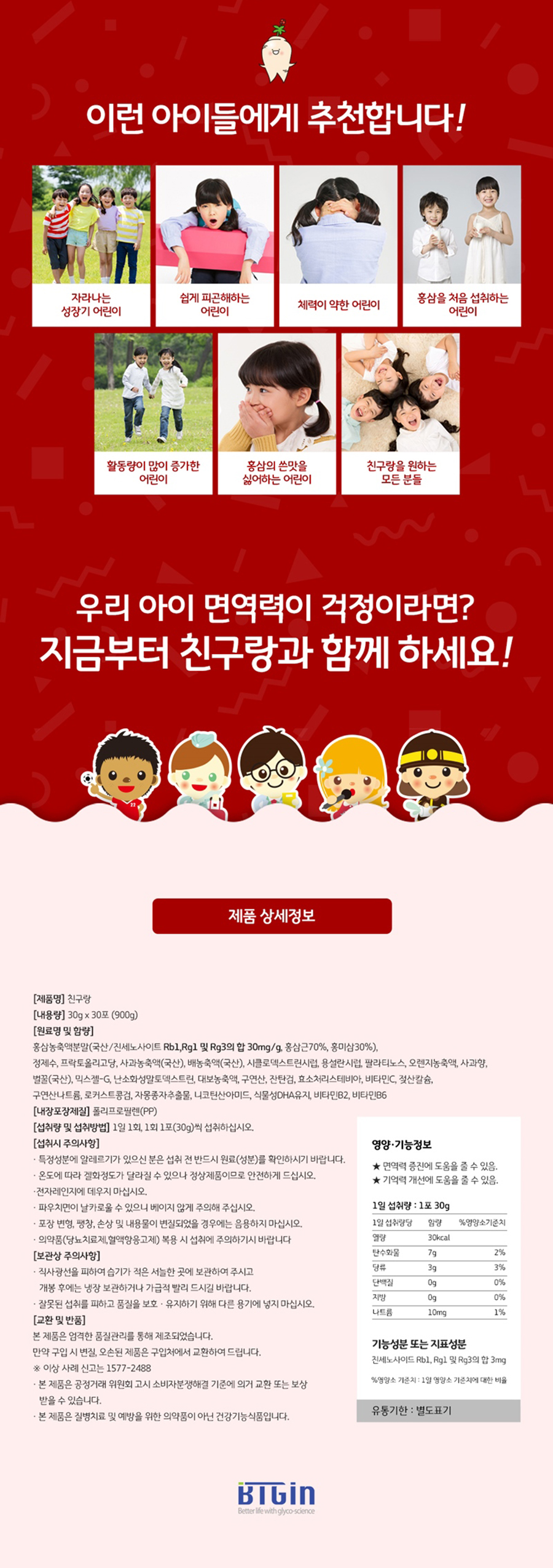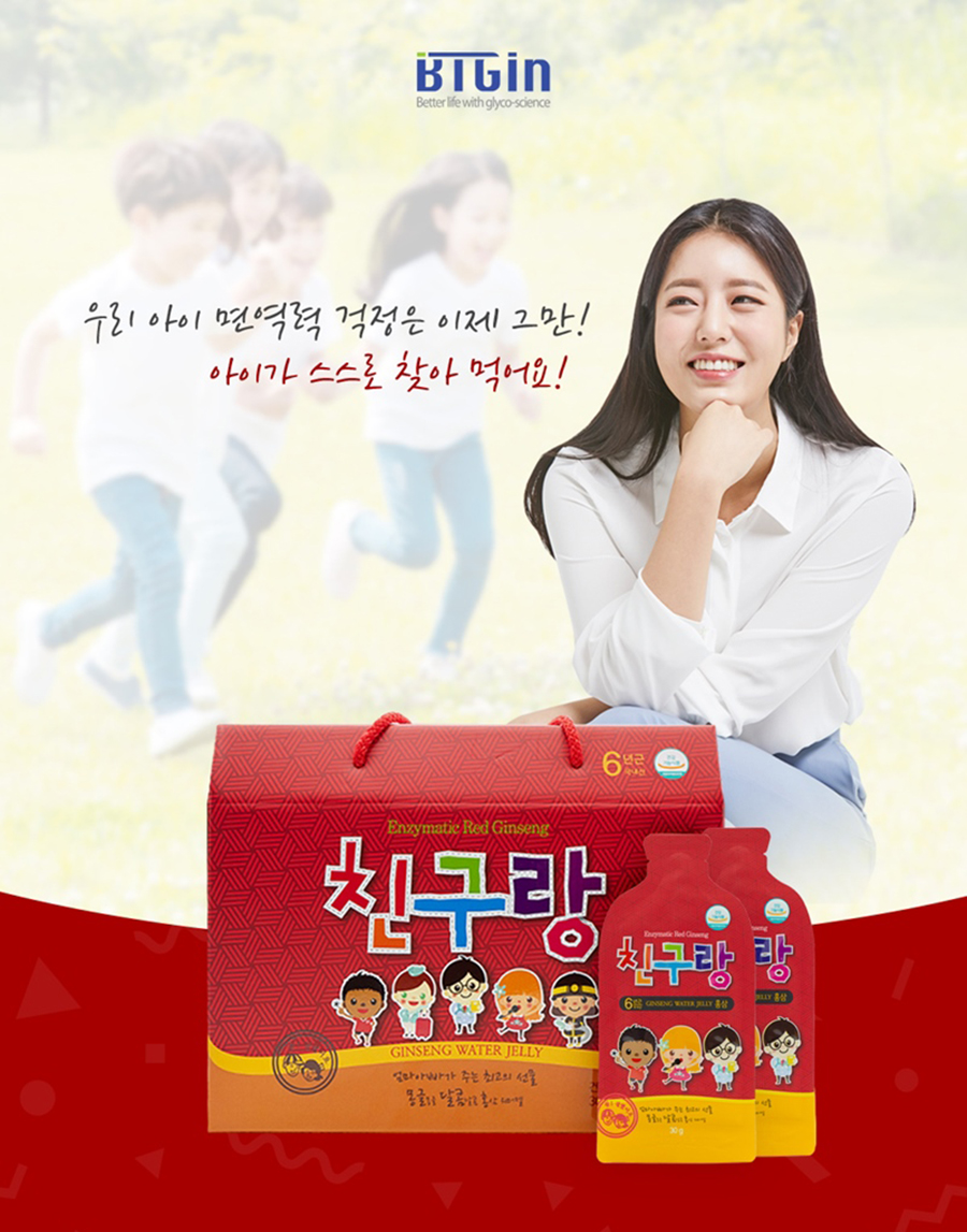 Thạch hồng sâm trẻ em Chin Gu Rang là sản phẩm dành riêng cho trẻ em của hãng BTGin - Hàn Quốc. Được nghiên cứu và sản xuất trên dây chuyền hiện đại đạt chuẩn (GMP) về sản xuất và quản lý chất lượng của Hàn Quốc. Sản phẩm của công ty được chứng nhận bởi Cục quản lý thực phẩm và thuốc của Hàn Quốc (KFDA) và của Mỹ (FDA) chứng nhận là dòng sản phẩm thực phẩm chức năng. Sản phẩm hiện được bán rộng rãi tại các cửa hàng Duty Free tại Hàn Quốc và chuỗi cửa hàng thực phẩm ở Mỹ.