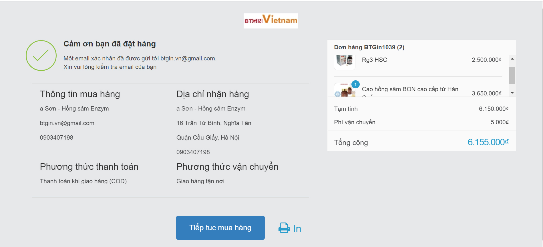 Bấm nút Đặt hàng để hoàn thành mua hàng tại website btginvietnam.vn