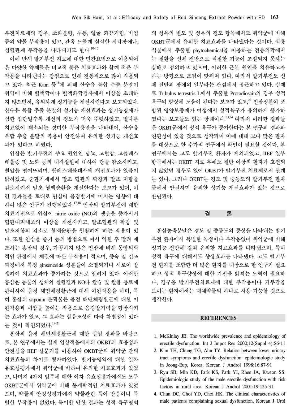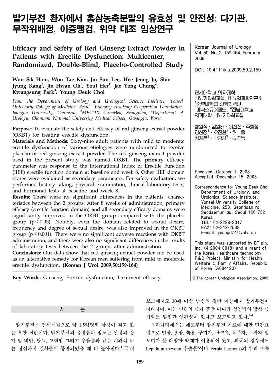 Kết luận: Dữ liệu thu được từ nghiên cứu này chỉ ra rằng bột chiết xuất hồng sâm của tập đoàn BTGin Hàn Quốc có tiềm năng là một phương pháp điều trị thay thế hiệu quả và an toàn cho rối loạn cương dương từ nhẹ đến trung bình ở nam giới. Các kết quả này mở ra hướng nghiên cứu tiếp theo trong việc sử dụng nhân sâm giàu hàm lượng Rg3 trong lĩnh vực chăm sóc sức khỏe sinh sản nam giới.