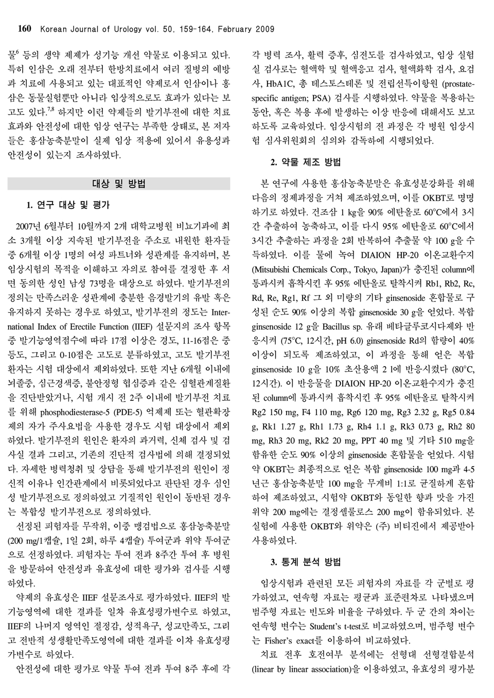 Phương pháp nghiên cứu: Nghiên cứu được thiết kế dạng ngẫu nhiên, mù đôi, có kiểm soát với giả dược, bao gồm 69 bệnh nhân mắc rối loạn cương dương từ nhẹ đến trung bình do nhiều nguyên nhân. Các bệnh nhân được chia ngẫu nhiên thành hai nhóm, nhận bột chiết xuất hồng sâm (OKBT - BTGin Hàn Quốc) hoặc giả dược. Hiệu quả của điều trị được đánh giá dựa trên điểm số Chỉ số quốc tế về chức năng cương dương (IIEF) ở thời điểm cơ bản và sau 8 tuần điều trị. Các thông số phụ trong miền IIEF cũng được theo dõi và đánh giá. Để kiểm tra tính an toàn, bệnh sử của bệnh nhân được thu thập, cùng với việc khám thực thể, xét nghiệm lâm sàng và xét nghiệm nội tiết tố tại thời điểm ban đầu và sau 8 tuần điều trị.