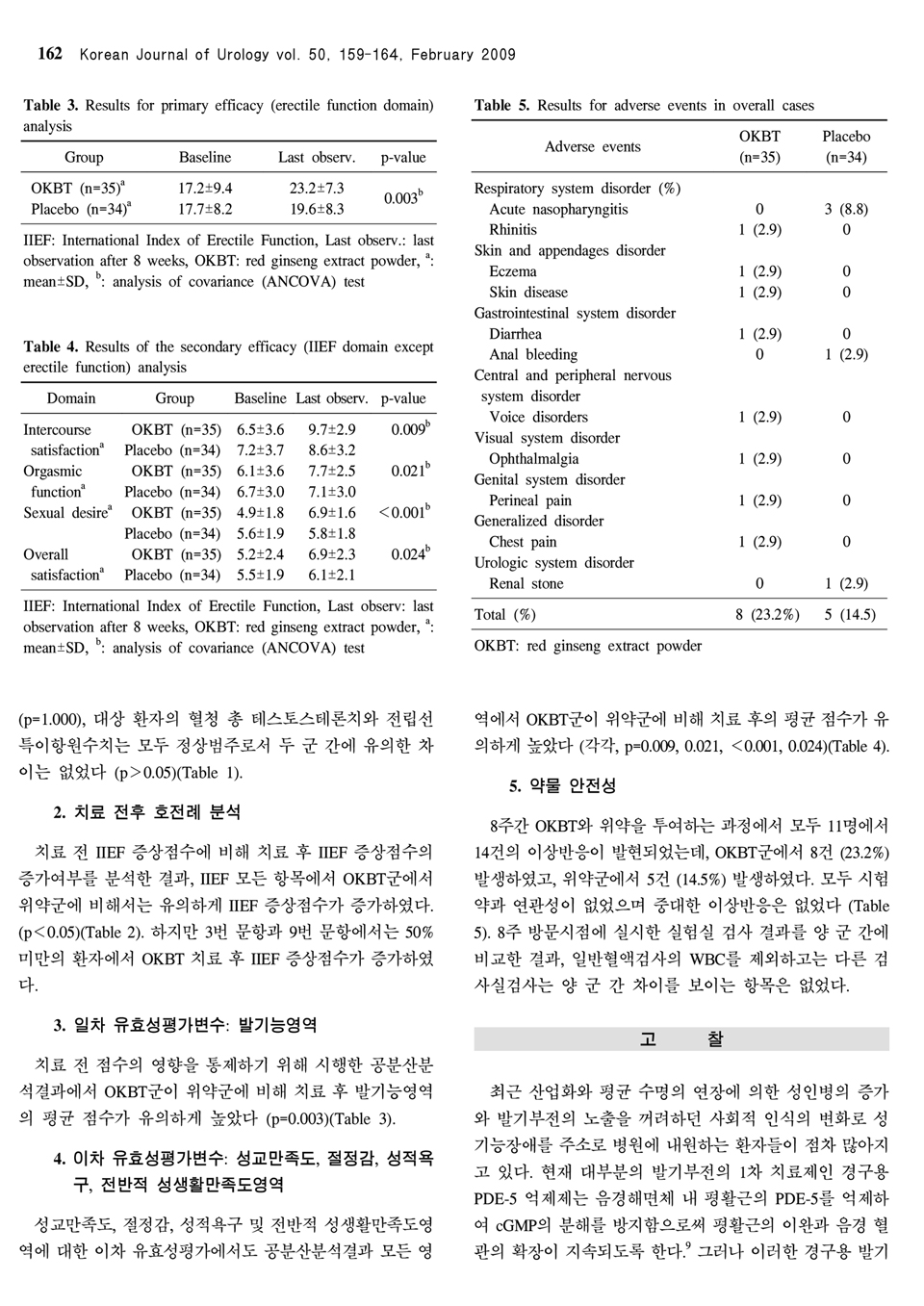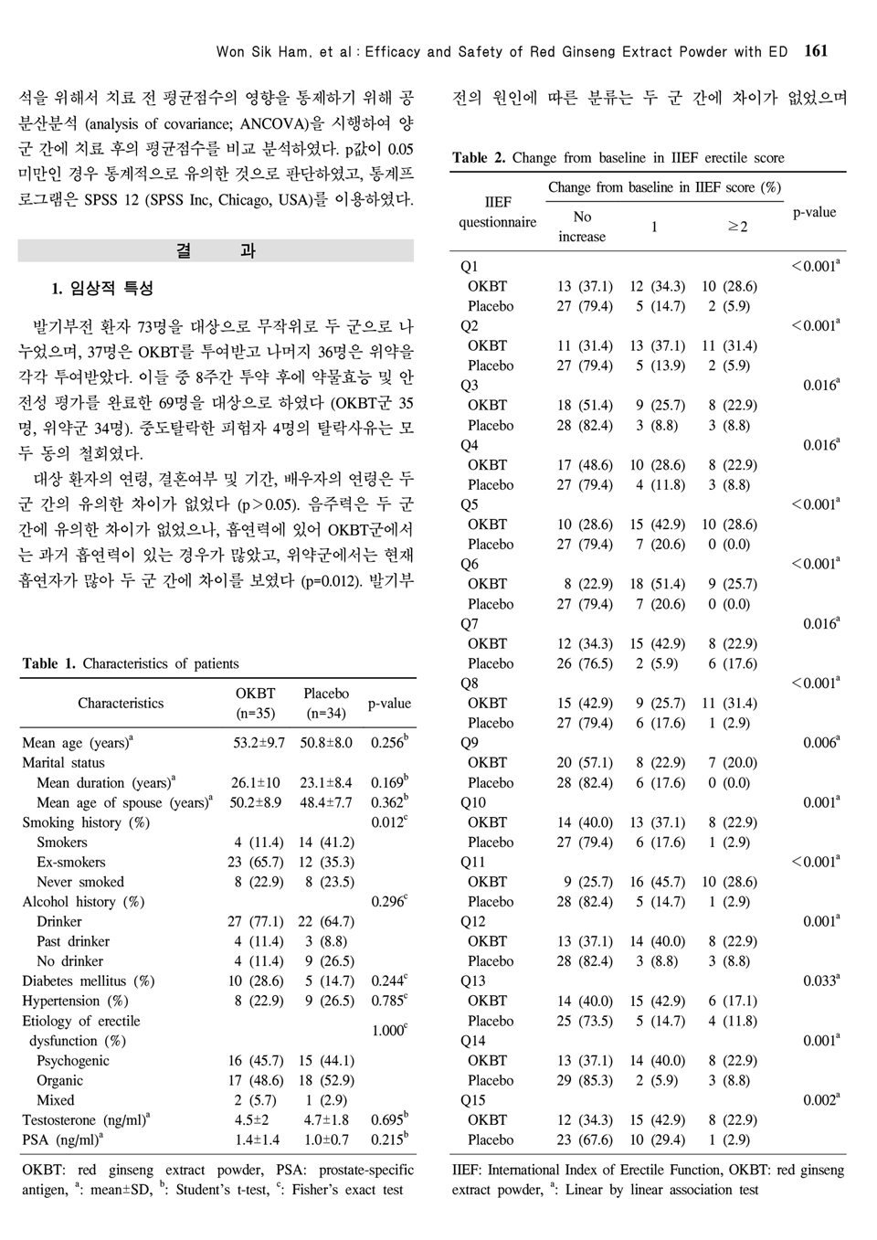 Kết quả: Không có sự khác biệt đáng kể về đặc điểm cơ bản giữa hai nhóm bệnh nhân. Sau 8 tuần điều trị, nhóm sử dụng OKBT cho thấy sự cải thiện đáng kể trong chức năng cương dương (chỉ số IIEF chính) so với nhóm giả dược, với giá trị p<0,05. Thêm vào đó, các lĩnh vực khác liên quan đến ham muốn tình dục, tần suất và mức độ ham muốn tình dục cũng cho thấy sự cải thiện đáng kể (p<0,001). Về mặt an toàn, không có phản ứng bất lợi đáng kể nào được báo cáo từ việc sử dụng OKBT - BTGin Hàn Quốc, và không có sự khác biệt về kết quả xét nghiệm lâm sàng giữa hai nhóm.