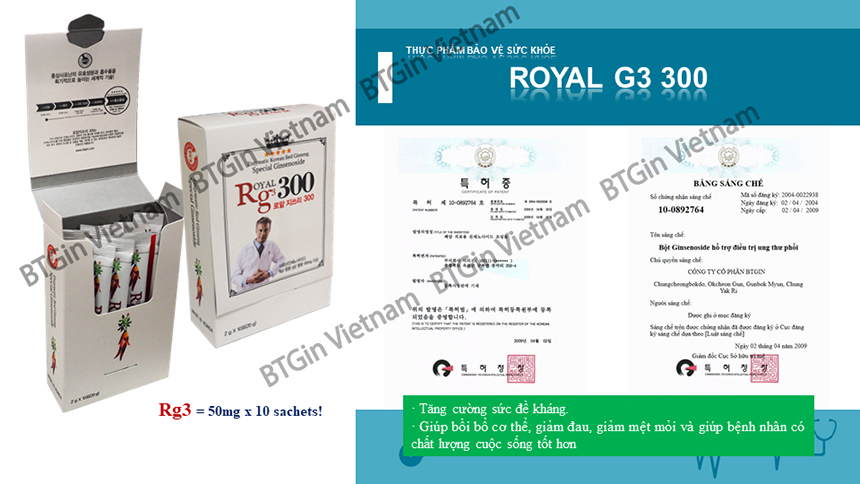 - Sâm Royal Rg3 300 là sản phẩm tinh chất hồng sâm lên men. Với công nghệ sử dụng enzyme độc quyền hàng đầu thế giới của hãng BTGin – Hàn Quốc. Ngoài quy trình chuẩn gồm 7 bước thông thường giống các nhà sản xuất khác, công ty có bổ sung 5 giai đoạn chuyển hóa, và phân tách đặc biệt để chiết tách gần như tối đa các ginsenoside đặc biệt quý và có tác dụng kháng ung thư cao như Rg3, Compound K, Rh1, Rh2, F2+K… gần như không có trong các sản phẩm tương tự. Trên dây chuyền hiện đại đạt chuẩn (GMP) về sản xuất và quản lý chất lượng của Hàn Quốc.