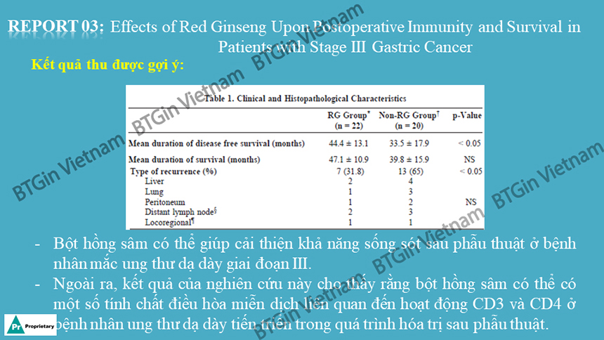 Tóm tắt: Trong lâm sàng, với các tiến hành từ các survey, nghiên cứu trên các nhóm bệnh nhân ung thư đều cho thấy bệnh nhân sử dụng Rg3 có thể kéo dài thời gian sống, tỉ lệ tái phát di căn ít hơn, có chất lượng cuộc sống tốt hơn nhờ ít có tác dụng phụ. Đặc biệt có nghiên cứu trên 133 bệnh nhân ung thư phổi (non small lung cancer) chỉ ra khi sử dụng 40mg Rg3 trên một ngày hoặc kết hợp với hóa trị đều giúp tăng hệ miễn dịch thông qua các chỉ số như Natural Killer, Lympho T – CD4 và Lympho T – CD8 đều tăng trở lại sau hóa, xạ trị.