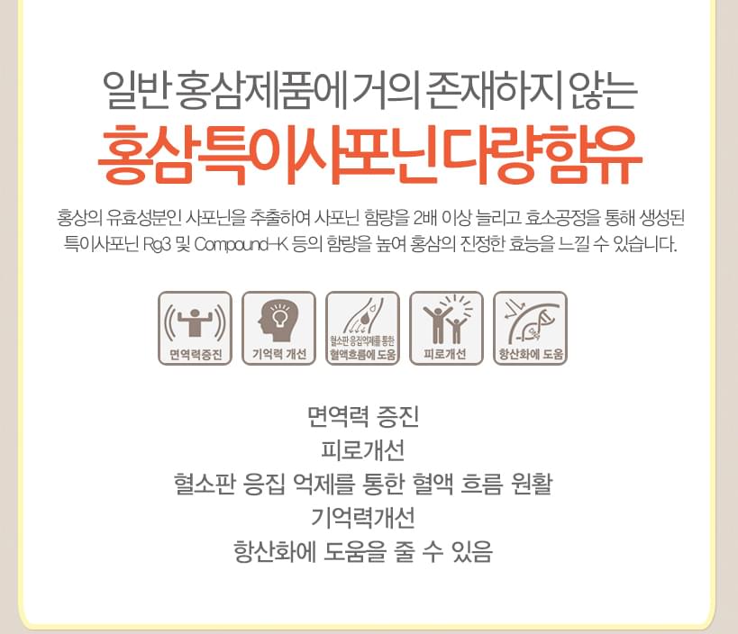 Thành phần: Bột hồng sâm lên men (với hàm lượng trong Rb1+ Rg1+ Rg3= 4.5mg/ gói), chiết xuất nước hoa quả cùng với các loại củ quả có lợi cho sức khỏe và tiêu hóa. Sản phẩm có 03 vị như mùi quả táo, mùi quả lê, mùi quả cam. Không hóa chất, không chất tạo màu.