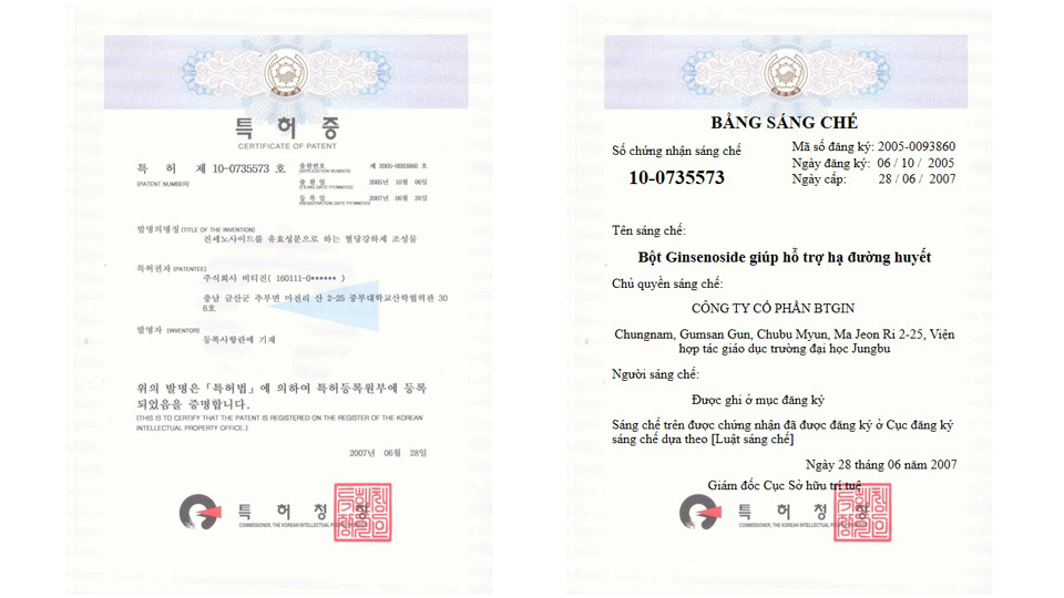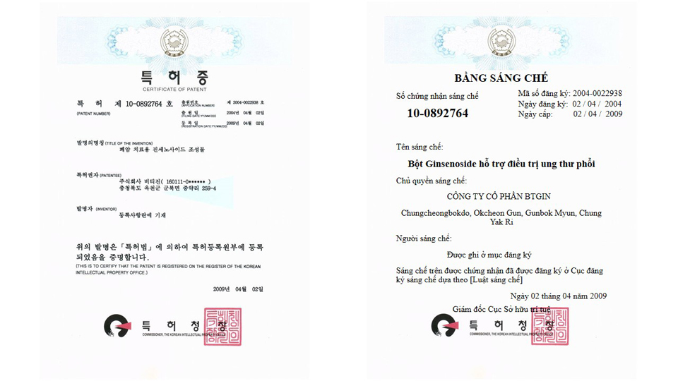 - Hỗ trợ điều trị ung thư phổi (Bằng sáng chế do chính phủ Hàn cấp, dược chất Rg3 đã được nghiên cứu lâm sàng trên K phổi, K gan, K dạ dày, …)