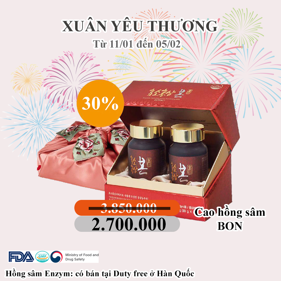 Cao hồng sâm BON cao cấp từ Hàn Quốc. Đây là sản phẩm 100% nước cốt hồng sâm lên men bằng enzym của công ty BTGin Hàn Quốc. Sản phẩm mang hương vị sâm nguyên chất đậm đà, cảm giác đắng nhẹ ở đầu lưỡi và hậu ngọt sau khi uống xong cốc nước cốt hồng sâm. Đặc biệt đây là cao hồng sâm duy nhất trên thị trường có chứa ba dược liệu quý là ginsenoside Rg3, compound K, và F2. Đây là những dược chất có dược tính mạnh mẽ từ nhân sâm (Trong 4g cao đặc có chứa Rb1+Rg1+Rg3=16mg; Rg3(s)=2.4mg; F2+K=2.4mg). Sản phẩm phù hợp cho người già, người cao huyết áp, và người bị tiểu đường.