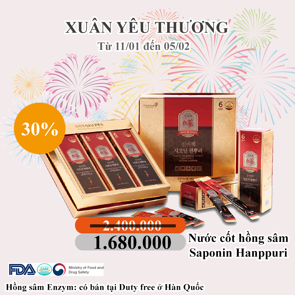 Nước cốt hồng sâm Saponin Hanpurri, sản phẩm nhập khẩu nguyên hộp chính hãng. Sản phẩm chứa 100% nước cốt hồng sâm được lên men bằng công nghệ enzym. Tạo cảm giác đậm đà khi sử dụng. Giúp tăng cường sự tỉnh táo, bổ sung dưỡng chất, duy trì sự tập trung cho công việc suốt cả ngày mà không có cảm giác đói và mệt. Hộp lớn có 3 hộp nhỏ, mỗi hộp nhỏ chứa 10 gói nước cốt 10g. Mỗi gói 10g cung cấp hàm lượng Rb1+Rg1+Rg3=13mg, riêng Rg3=2mg và Compound K=0.3mg.